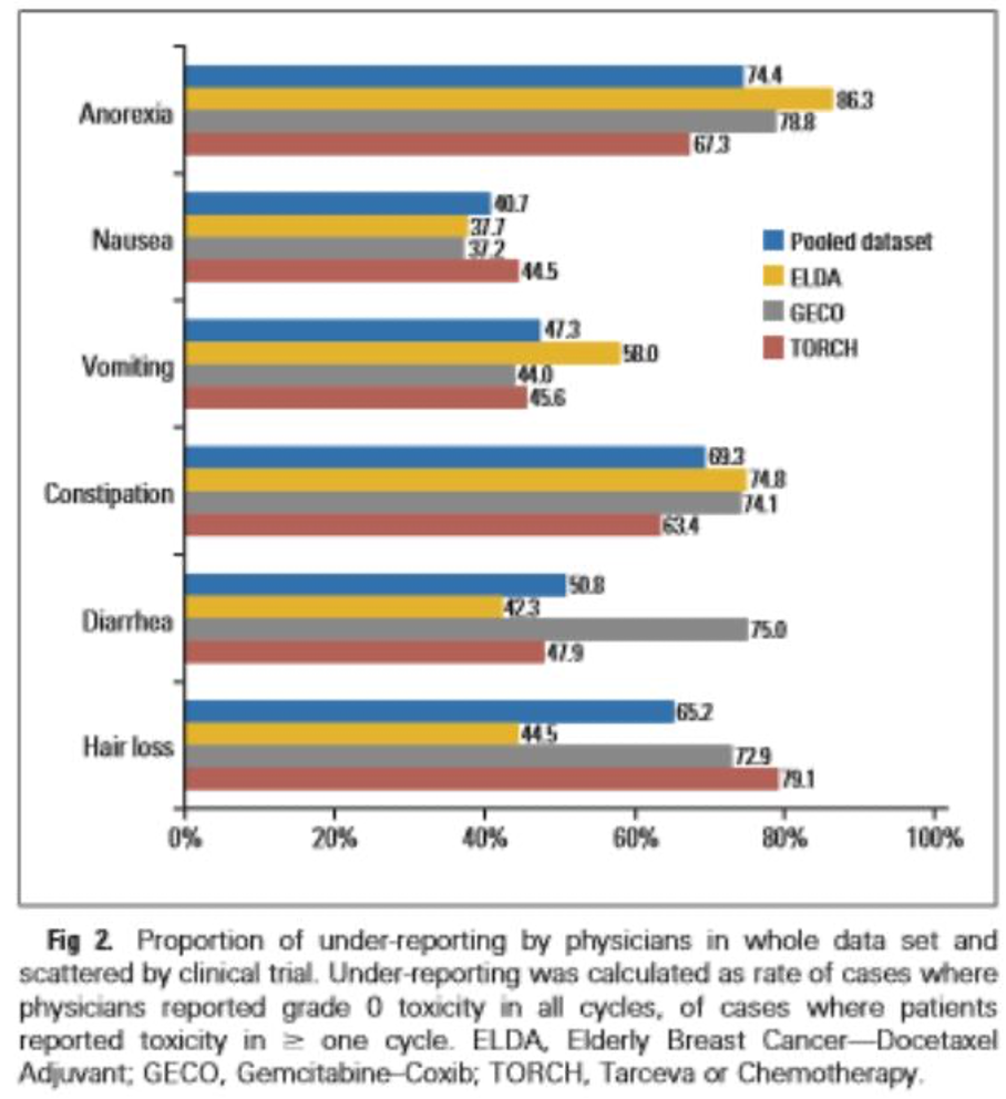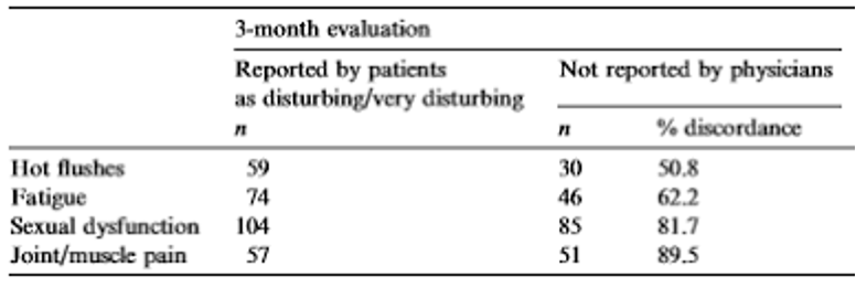 L’analyse de ces études portant sur la discordance médecins/patients montre que le médecin a tendance à déclarer davantage (voire uniquement) les effets secondaires qui engagent le pronostic vital des patients, comme par exemple l’anémie, la fièvre, mais néglige d’autres effets indésirables qui pour autant peuvent être source d’une véritable source d’inconfort et de de souffrance pour les malades. Une étude réalisée chez des patients traités pour un cancer de la prostate a montré que même dans le cas d’effets secondaires déclarés comme très gênants par les patients, un taux important de discordance persiste.