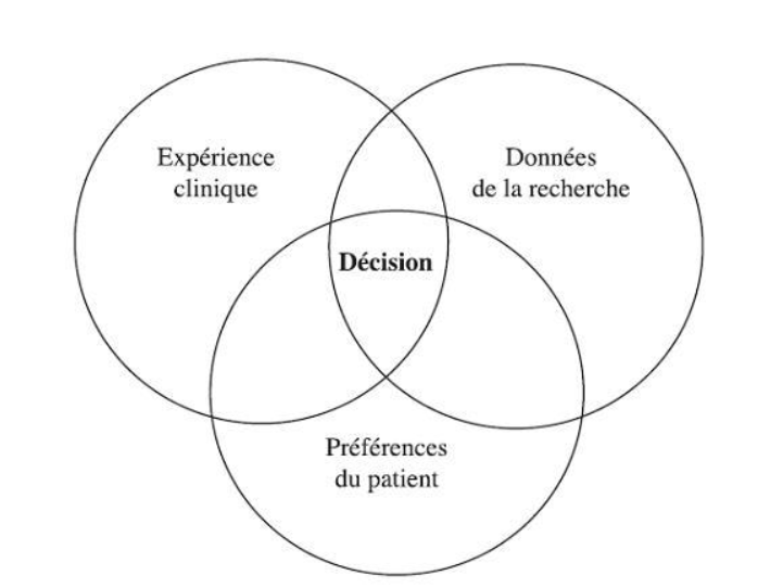 Depuis 1992 (EBM working Group 1992), l’« evidence-based medicine » (EBM) est définie comme l’utilisation consciencieuse, explicite et judicieuse des meilleures données scientifiques du moment, pour une prise en charge personnalisée de chaque patient (Sackett, et al 1996). Le modèle visuel simplifié qui la résume permet de souligner que les préférences des patients doivent être prises en compte. Ainsi, expérience clinique, données de la recherche et préférences du patient vont se confronter pour parvenir à une décision qui rassemble les trois visions sur la meilleure décision à prendre. (Figure 1 (Taieb, et al 2005)), rappelant la complémentarité entre evidence-based medicine et shared decision-making (Hoffmann, et al 2014).