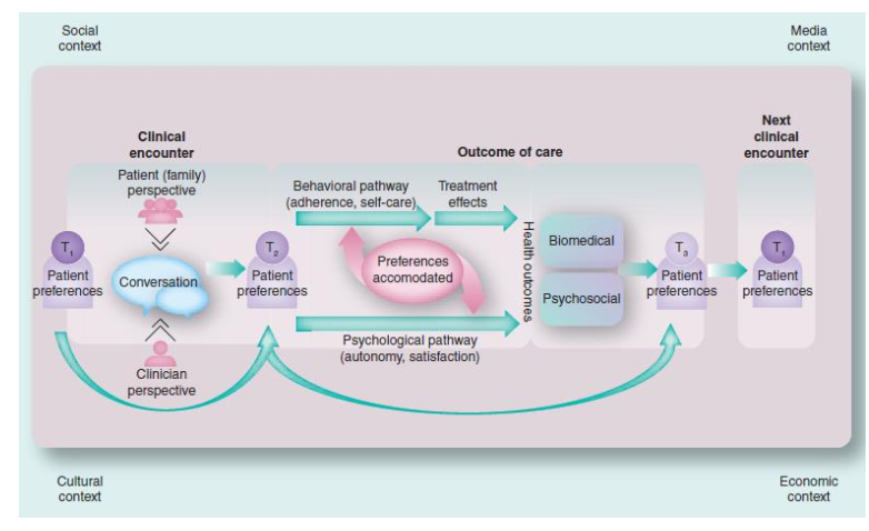 Le modèle écologique (Figure 3) plus récemment proposé (Street, et al 2012) insiste aussi sur le caractère dynamique des préférences des patients que ce soit pour une alternative thérapeutique précise ou simplement envers leur prise en charge (souhaits d’information et d’implication dans la décision). Celles-ci peuvent changer après une discussion initiale et une information adaptée peut contribuer à l’amélioration de la santé psychosociale simplement via une amélioration de la satisfaction et un renforcement du sentiment d’autonomie. Il est à noter que la santé est ici considérée globalement en intégrant à la fois le caractère biomédical mais aussi psychosocial.